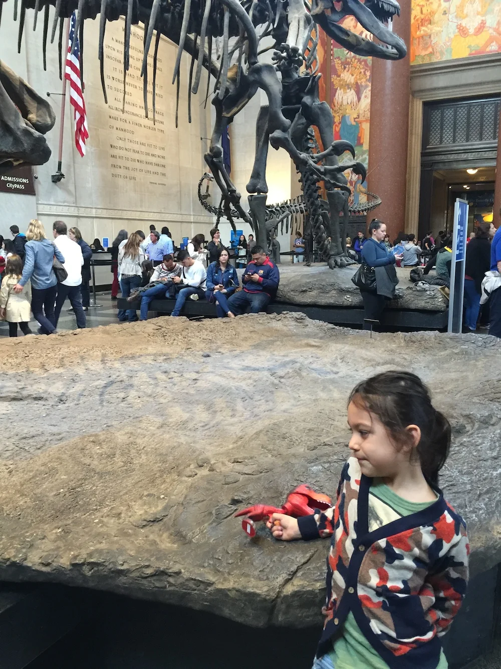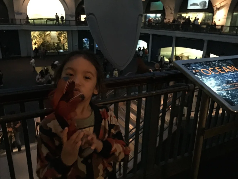 My family's favorite day in New York City was the day we went to the American Museum of Natural History. We took the subway uptown and discovered what seemed like an endless line to get into the Museum going around the block and around the block again. I wasn't sure Mario or my husband would have the patience to wait in such a long line, but Mario knew that there were Dinosaurs inside and patiently waited to explore the enormous Museum.